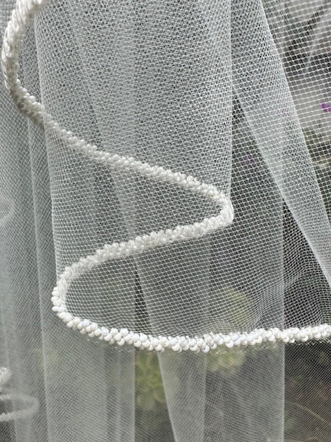 40” (90”) flutter cut with an edge of delicate clustered beads in a row on a wire comb…