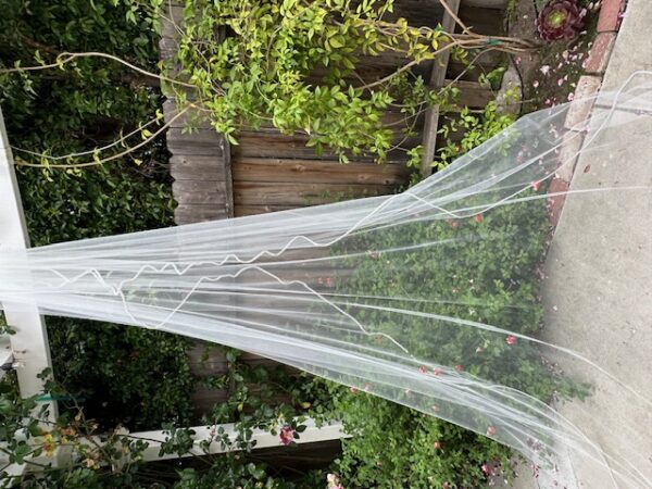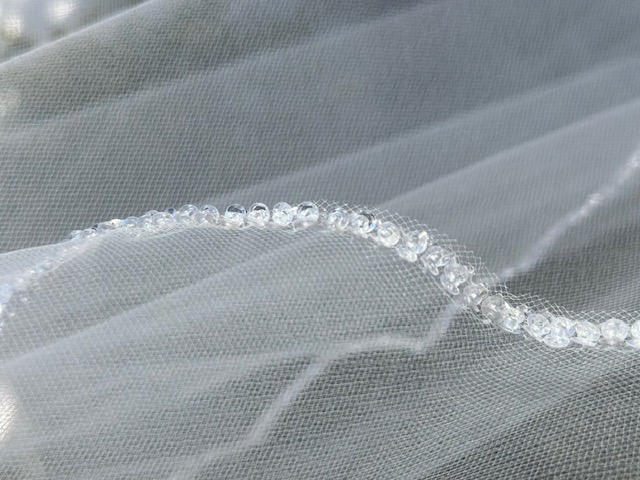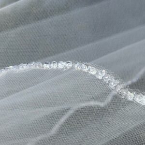 120” long (108”) flutter cut w/a double row of clear sequins & beads on a wire comb….