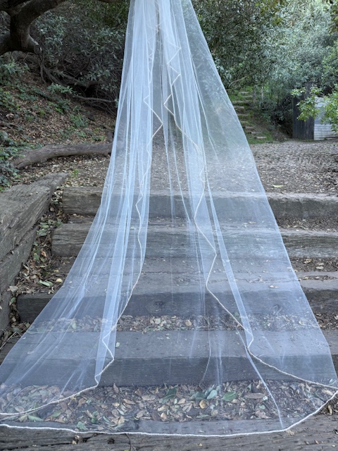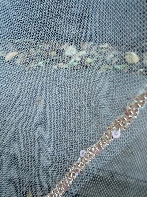 110” (108”) flutter cut with a 1/8” beaded edge of champagne sequins & beads… Diamond white,
