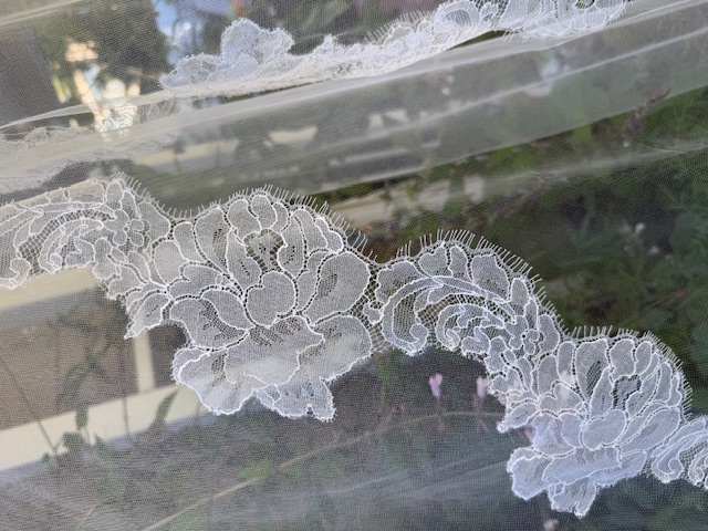 72” long mantilla w/2” scallop Chantilly lace that graduates to 5” width…..