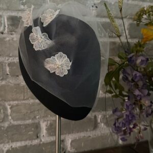 A 12” French net blusher with lightly scattered 3mm rhinestones across the top on a small wire comb.